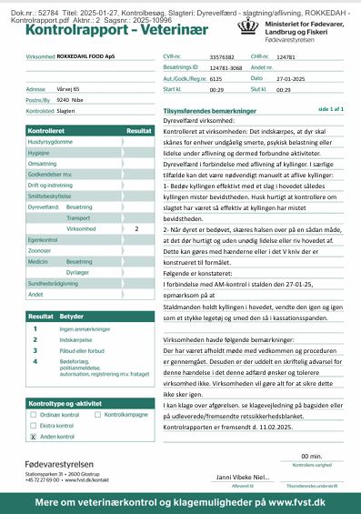 Fødevarestyrelsen var på et veterinært kontrolbesøg på Rokkedahl’s slagteri i Nibe i Nordjylland den 27. januar 2025. Det er et slagteri der afliver millioner af kyllinger hvert år. Under kontrollen blev kun en enkelt observation nedskrevet. Det undrer jeg mig over, da der givetvis har været tusindevis af kyllinger på slagteriet, imens kontrollen stod på.