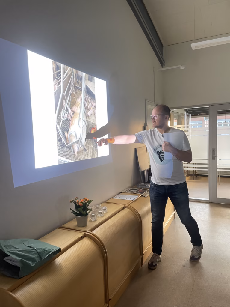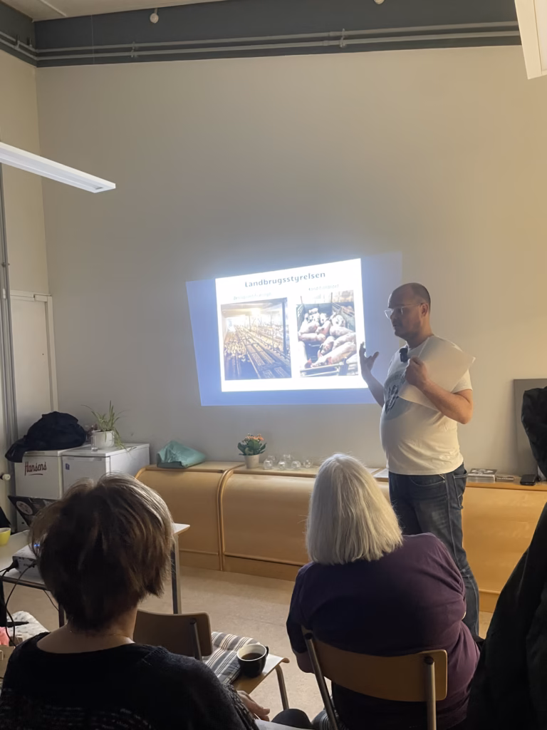 Torsdag den 16. april 2026 debuterede Dyrenes Detektiv som foredragsholder. Og sikke en debut, for det skete med deltagelse af Per Bardrum, der er direktør hos Danske Svineproducenter, blandt tilhørerne. Det er den forening Jeppe Bloch Nielsen er formand for. Og også Journalisten, Anne Wolfenberg fra Effektivt Landbrug, deltog i foredraget.