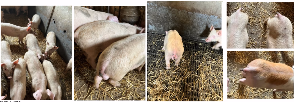 - Halebidte grise uden hjælp: I klimastalden gik ti grise med halebid i varierende grad. De udviste tydelige tegn på smerte med sænkede haler og infektion, men ingen var sat i behandling eller isoleret i sygestier med blødt leje.